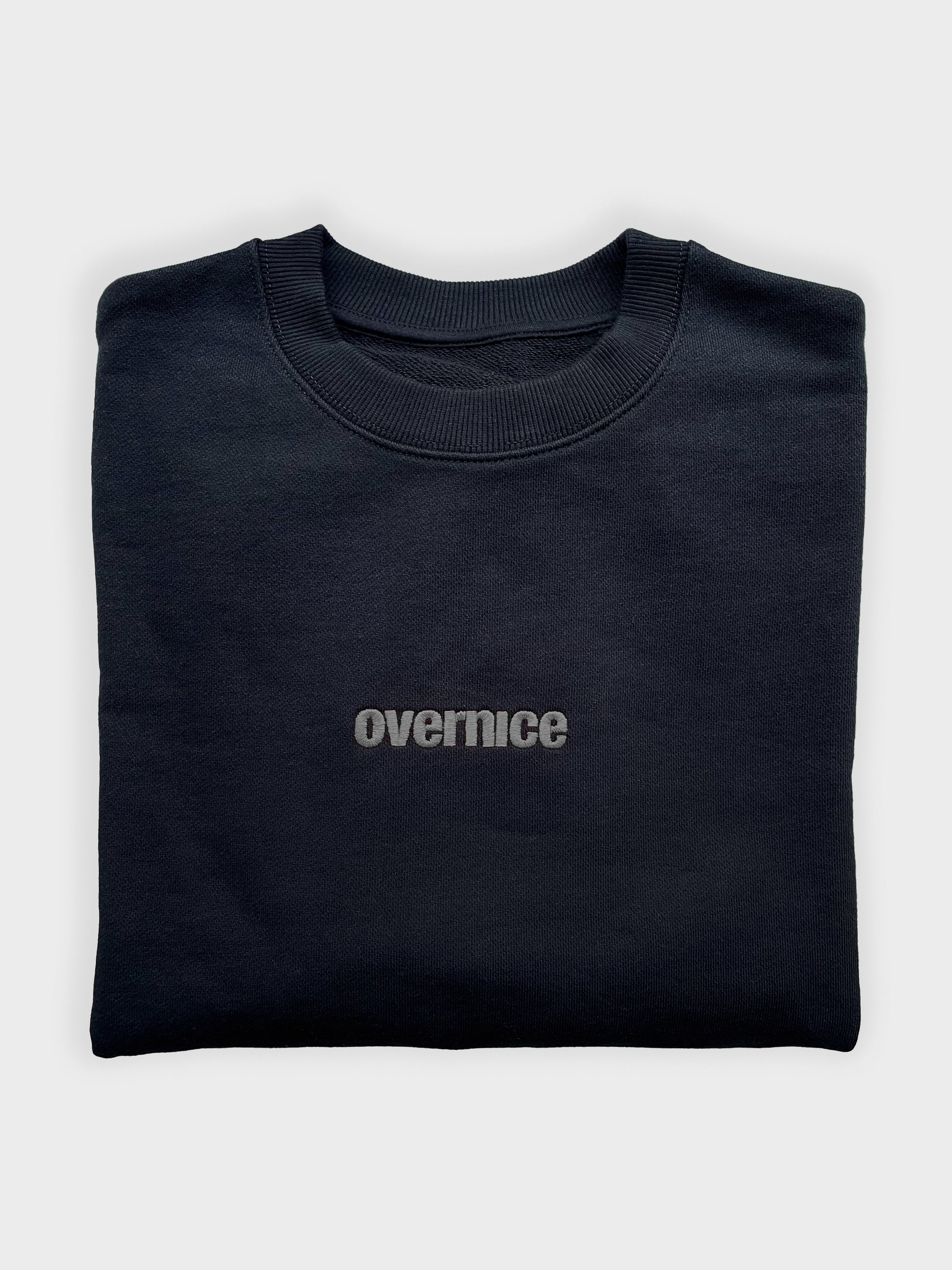 Deep black luxury crewneck with tone-on-tone Overnice logo.